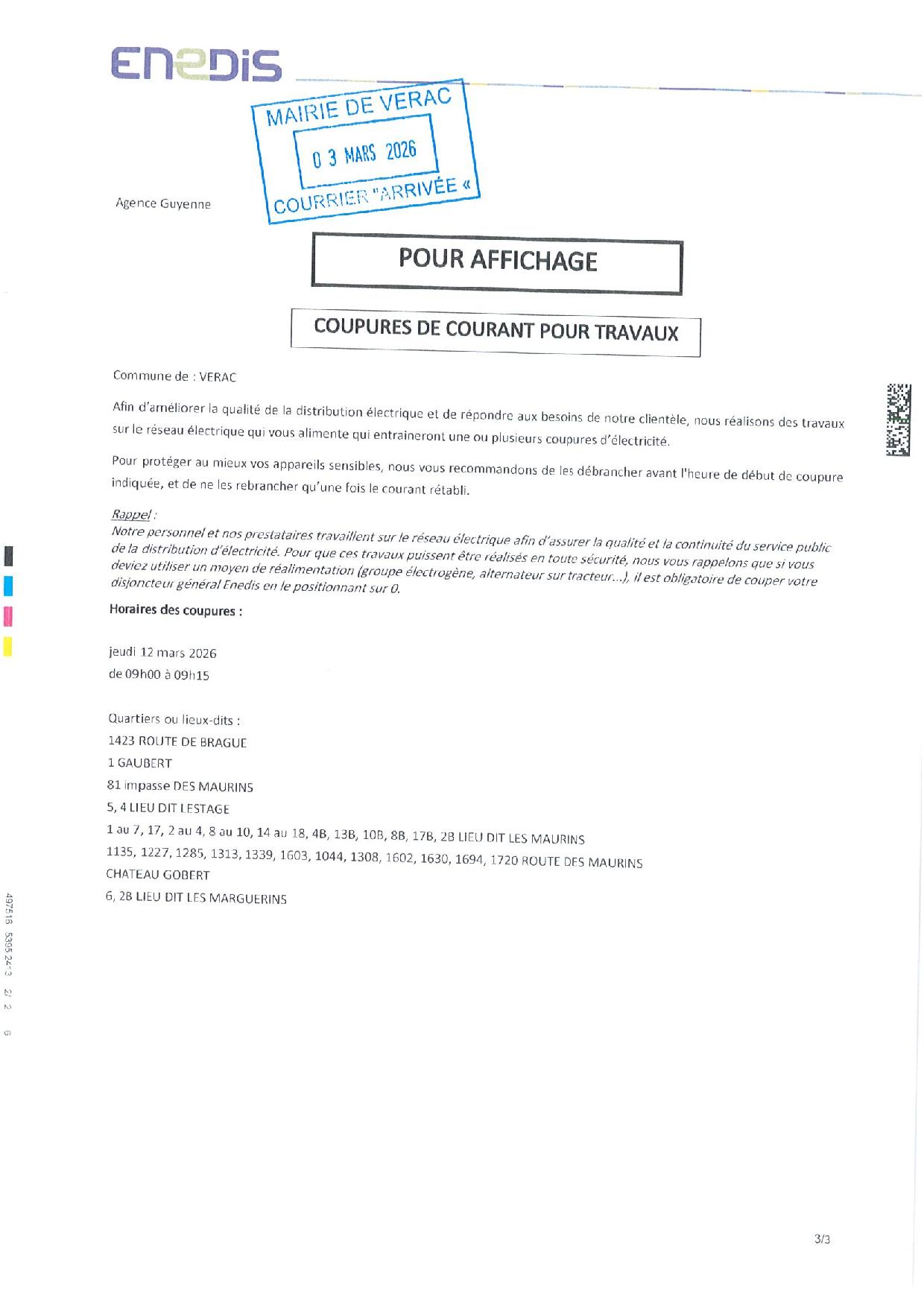 COUPURE DE COURANT POUR TRAVAUX – 12 MARS
